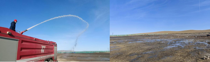 在此次工作中,環(huán)保管理部協(xié)調相關部門,出動消防車和灑水車,對填埋場重點區(qū)域及周邊道路,進行了大范圍噴灑,一定程度緩解了消除了揚塵現(xiàn)象,改善了周邊環(huán)境的空氣質量。