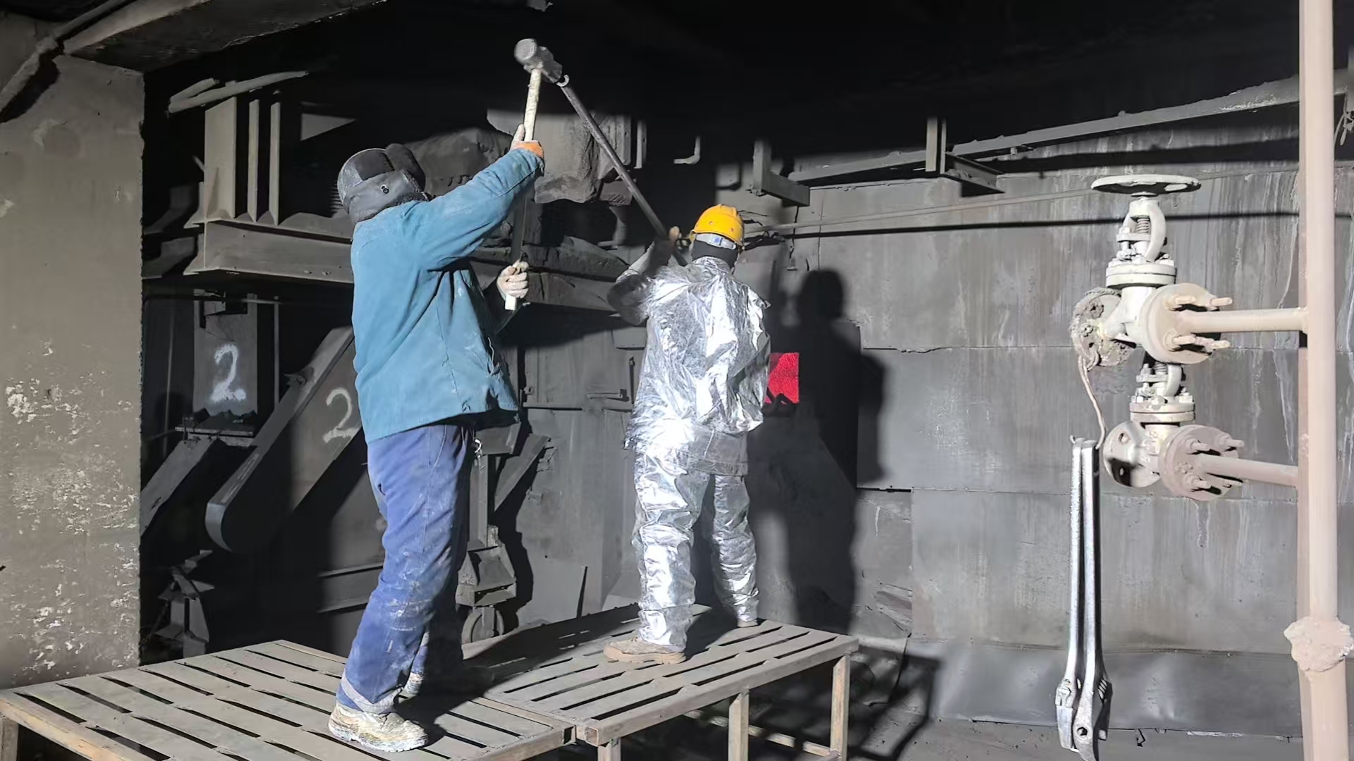 此次搶修工作,要在沸騰爐運(yùn)行中處理掛壁結(jié)垢,時(shí)間緊、任務(wù)重、清理難度大。作業(yè)前,車間對(duì)參與清理的班組人員進(jìn)行了安全告知,要求必須要在保證個(gè)人防護(hù)措施有效的情況下作業(yè),并準(zhǔn)備好應(yīng)急物資,確保搶修清理工作安全推進(jìn)。搶修期間,車間員工齊參戰(zhàn),爭分奪秒推進(jìn)清理進(jìn)度,最大限度對(duì)拋料口周圍進(jìn)行結(jié)垢清理,歷經(jīng)10個(gè)小時(shí)的堅(jiān)苦搶修,沸騰爐基本恢復(fù)正常生產(chǎn),有效保障了焙砂和蒸汽的供給。